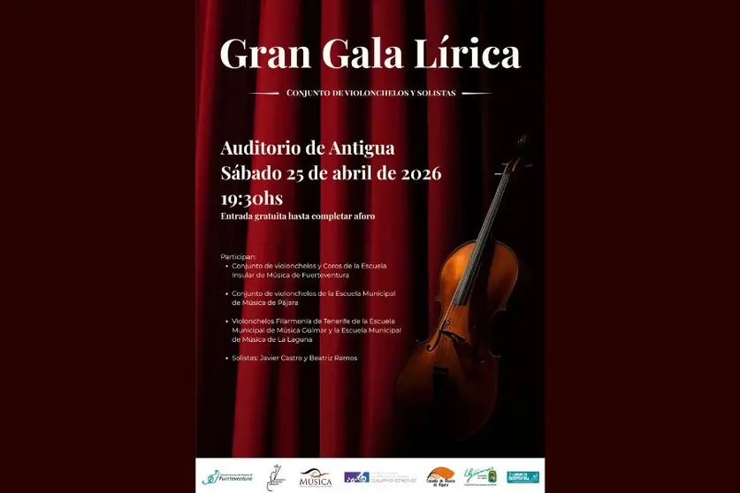 La Escuela Insular de Música celebrará el próximo sábado, 25 de abril, la Gran Gala Lírica, un concierto que reunirá a destacados conjuntos de violonchelo y solistas en el Auditorio de Antigua. La cita tendrá lugar a partir de las 19.30 horas.