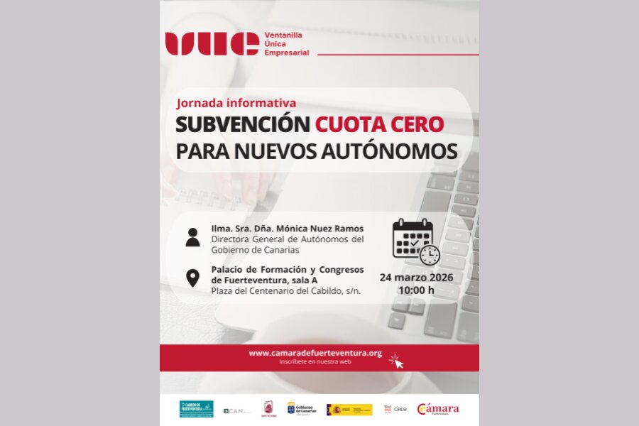 La Cámara de Comercio de Fuerteventura, en colaboración con la Dirección General de Autónomos del Gobierno de Canarias, celebrará este martes, 24 de marzo, una jornada informativa centrada en la Subvención Cuota Cero para Autónomos 2026, una iniciativa destinada a fomentar el emprendimiento y facilitar la consolidación del trabajo por cuenta propia en las islas.