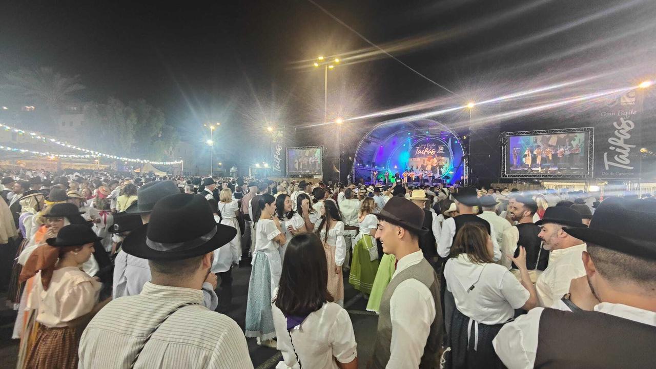 Alrededor de 6.000 personas se han congregado en el Gran Baile de Taifas en la Avenida Marítima de Puerto del Rosario. La música, la gastronomía tradicional y el baile se dieron cita en un ambiente familiar con un montaje de 260 mesas repartidas en nueve áreas diferentes bajo el nombre de las ocho islas canarias y el Islote de Lobos.