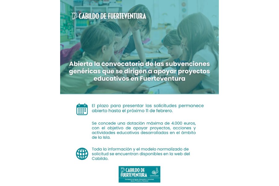 El Cabildo de Fuerteventura, a través de su Consejería de Educación, ha abierto la convocatoria de subvenciones genéricas en materia de educación, destinadas a apoyar proyectos educativos que se desarrollen en el ámbito insular. El plazo para la presentación de solicitudes permanecerá abierto hasta el próximo 11 de febrero.