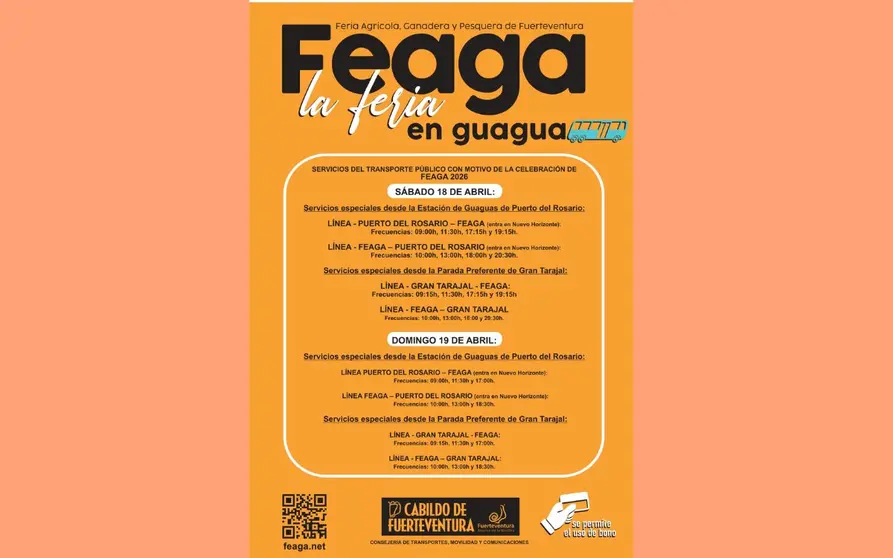 Durante la jornada del sábado 18 de abril, se habilitarán varias frecuencias desde la Estación de Guaguas de Puerto del Rosario hacia FEAGA, con salidas a las 09:00, 11:30, 17:15 y 19:15 horas, incluyendo paso por Nuevo Horizonte. En sentido inverso, desde FEAGA hacia Puerto del Rosario, las guaguas partirán a las 10:00, 13:00, 18:00 y 20:30 horas.