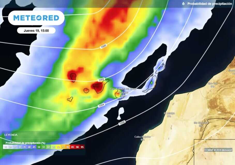 Según los modelos meteorológicos, la situación comenzará a cambiar a medida que una borrasca fría se sitúe al oeste de la Península Ibérica, generando un flujo de aire más húmedo y provocando que las precipitaciones se extiendan progresivamente por Canarias.
