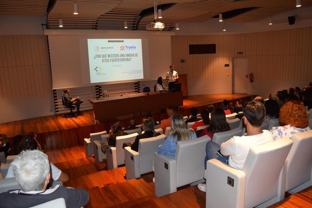 El encuentro, celebrado en el salón de actos del Hospital General de Fuerteventura, se enmarca dentro de un ciclo de actualización del manejo del ictus impulsado a nivel regional por el Servicio Canario de la Salud (SCS). Esta primera charla se centró en el objetivo europeo de que el primer nivel de atención para un noventa por ciento o más de los pacientes con ictus se deben tratar en una Unidad de Ictus.