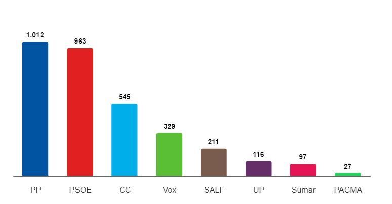 Muy por detrás Coalición Canaria en tercera posición con 3.004 votos, seguido muy de cerca por Vox que ha logrado 2.819 votos en la isla.