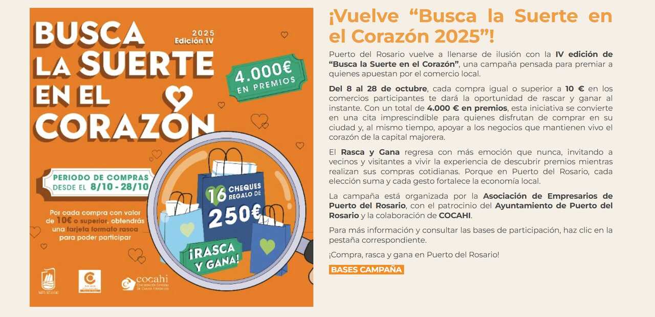 La Asociación Empresarios Puerto del Rosario ha puesto en marcha una nueva edición de la campaña de dinamización comercial “Busca la Suerte en el Corazón”, que celebra este año su cuarta edición. La iniciativa, que se desarrollará del 8 al 28 de octubre, cuenta con el patrocinio del Ayuntamiento de Puerto del Rosario y la colaboración de COCAHI (Confederación Española de Cascos Históricos).