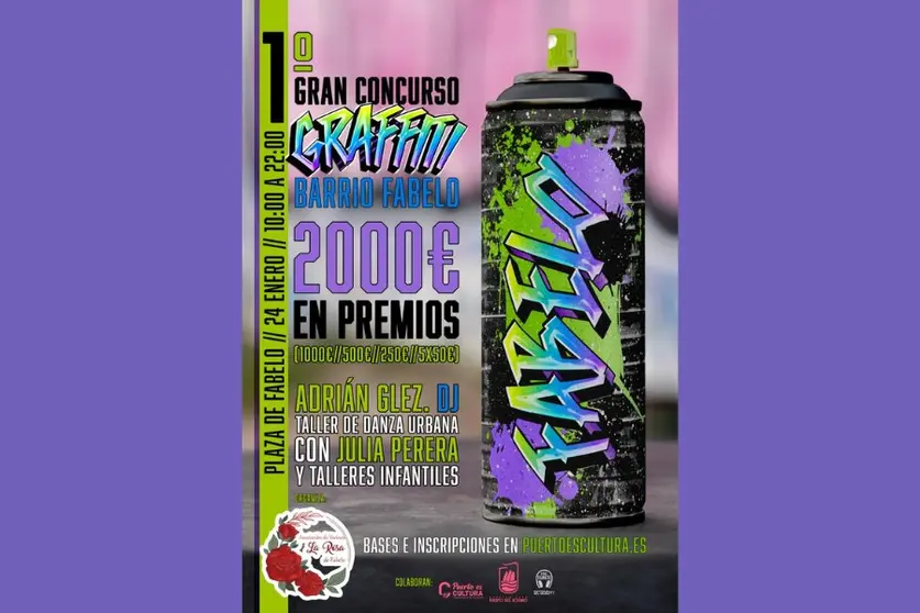 El barrio de Fabelo será escenario el próximo 24 de enero del I Gran Concurso de Graffiti – Barrio Fabelo, una iniciativa cultural que apuesta por el arte urbano como herramienta de dinamización social, convivencia vecinal y participación ciudadana. El certamen está impulsado por la Asociación de Vecinos La Rosa del Fabelo y cuenta con la colaboración del Ayuntamiento de Puerto del Rosario.