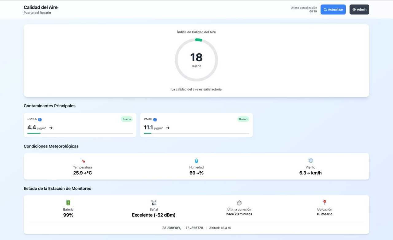 A través del portal aire.discoverpuerto.es, cualquier persona puede consultar el Índice de Calidad del Aire (ICA) y los niveles de los principales contaminantes (PM2.5 y PM10), junto con información meteorológica complementaria como temperatura, humedad y velocidad del viento.