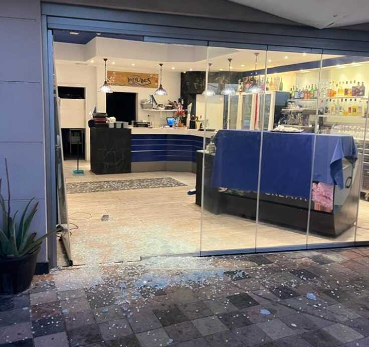 La puerta de seguridad rota a base de golpes, cristales en el suelo, restos de sangre y una caja vacía. Es la imagen que ofrecía esta mañana el restaurante Amares, en la zona de la playa de El Castillo. A los desperfectos se añade la pérdida de ingresos por la imposibilidad de abrir las puertas estos días y aprovechar este puente.