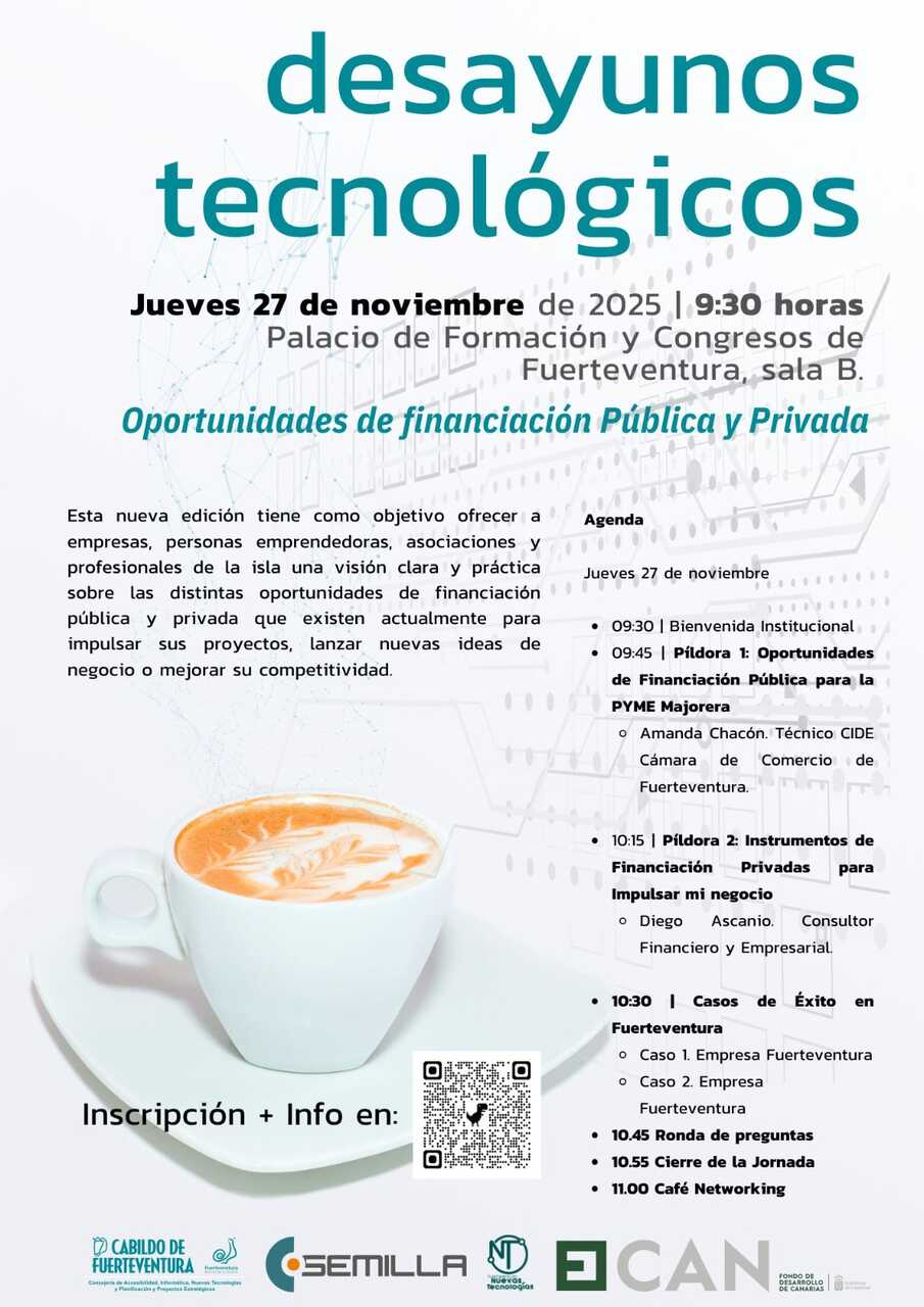 El Cabildo de Fuerteventura, a través del Área de Nuevas Tecnologías, presenta una nueva edición de los Desayunos Tecnológicos, que en esta ocasión lleva por título “Oportunidades de Financiación para mi Empresa”. El encuentro tendrá lugar el próximo miércoles 27 de noviembre, entre las 09.30 y las 11.30 horas, en el Palacio de Formación y Congresos de Puerto del Rosario.